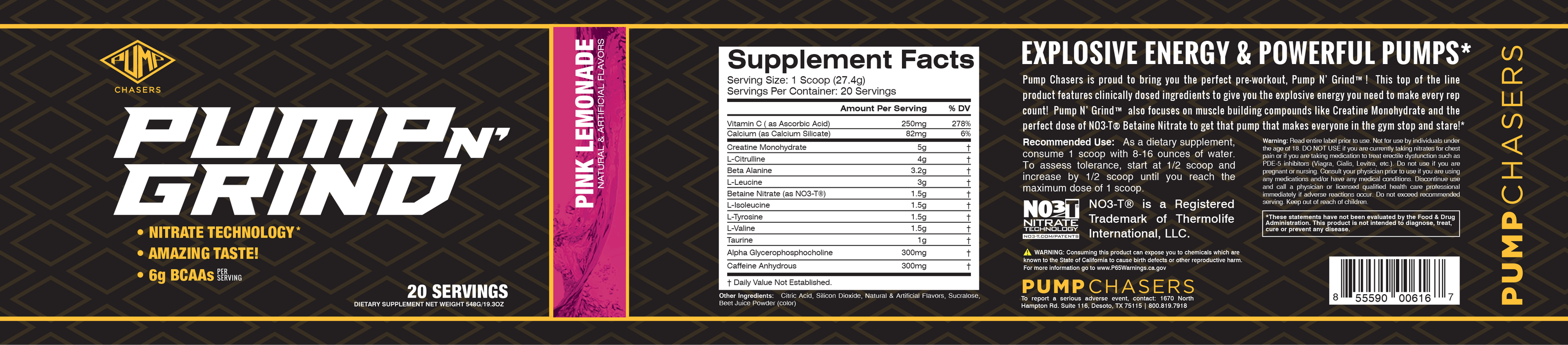 Pump Chasers brings you the all new powerful pre-workout, Pump N' Grind! This top of the line product features clinically dosed ingredients that will help bring you the explosive energy that you need to make every rep count! Pump N' Grind also focuses on the muscle building compounds by adding in Creatine Monohydrate and the perfect dose of Betaine Nitrate to get that pump that makes everyone in the gym stop and stare! You'll notice that the pumps, focus and energy you get from this product are unlike any pre-workout you've ever tried!