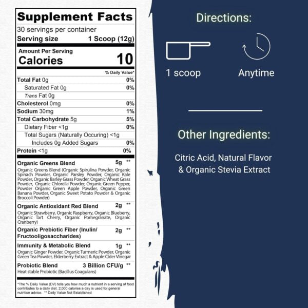 Reds Superfood Blend – Includes beet root, pomegranate, goji, blueberry, and acai for powerful antioxidants that promote blood flow and heart health.